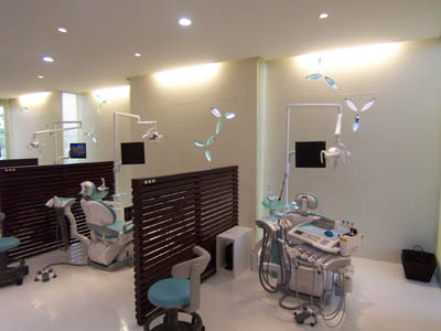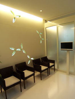 坪井)これは待合室です。歯医者さんみたいじゃないですけれど。歯医者さんって、あまり皆行きたくないじゃないですか。リラックスできる空間を心がけていたみたいです。これは診療室です。このスリット部分のブラインドも緑色になったりして、全体的に葉っぱの調子と合わせてあります。サインも末光さんの方でデザインされていて、ここにも葉っぱのデザインがあります。