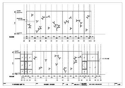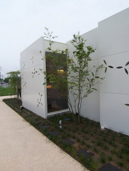 坪井)葉っぱの模様がちりばめられていて、仕上げはどうしても鉄板にしたいとの事でした。それをどうやって造ってゆくかというのが主なポイントでした。鉄骨造で鉄板構造となると、外壁部分と柱の部分でヒートブリッジが起こります。そういう話もあり、今回は鉄板構造ではなく他でやれないかということになりました。結構壁面が大きいのですが、3×6板とか4×8板とか鉄板にも規格があるため、ある程度の大きさ以上になると一枚で持って来られず、継ぎ目が出てきます。