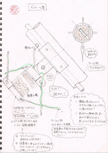 この案自体は、とても気に入っている案です。まず仲さんから、緑を空中に飛ばしたいと要望がありました。水筒みたいなものに土と水をつめて、そこから蔓を伸ばせないかと。そのためのフレームを考えて欲しい、ということで話がきました。